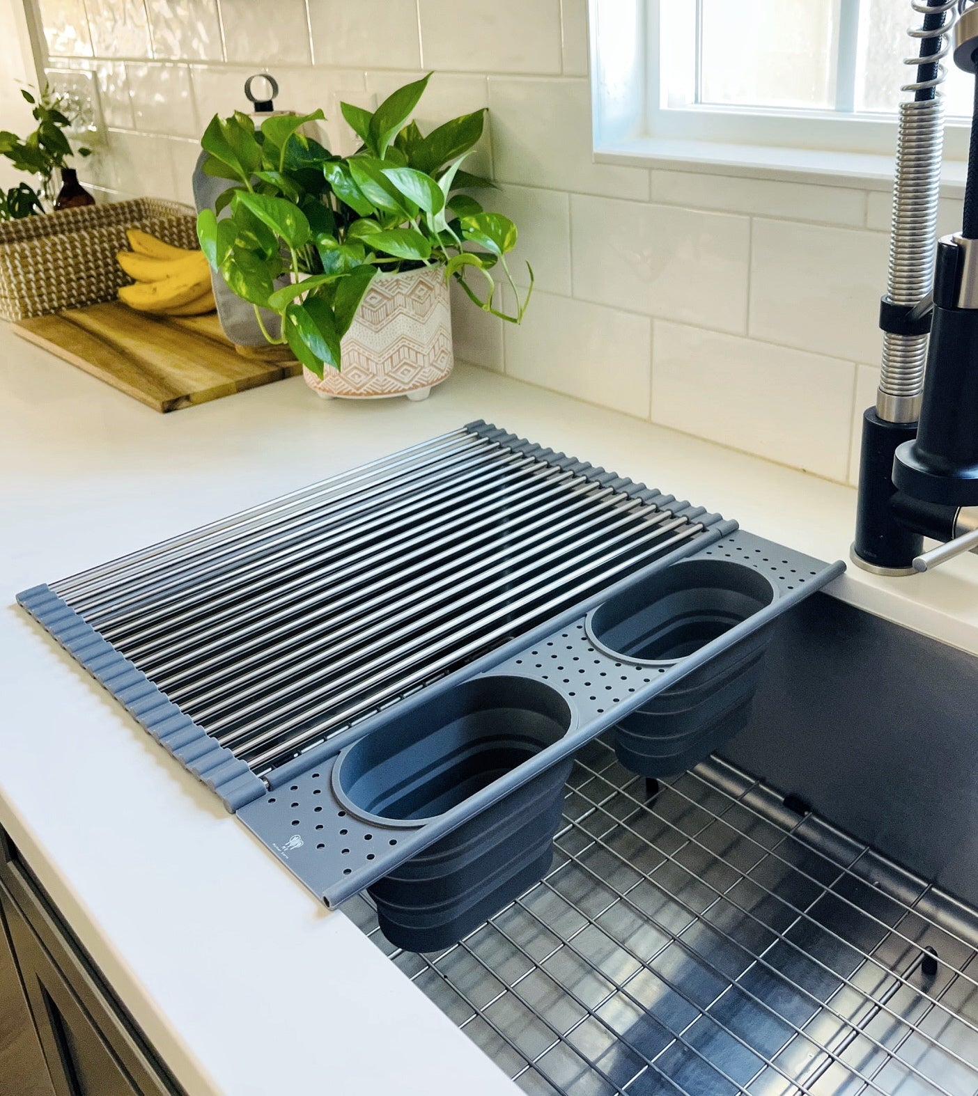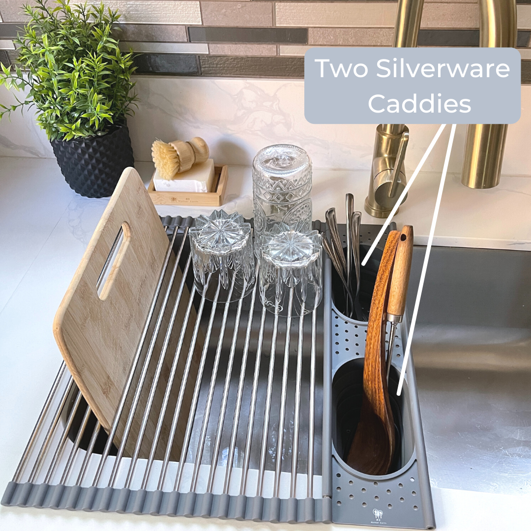 Ditch bulky plastic countertop drying racks for our space-saving roll-up dish rack! Our roll up dish rack is made from high quality food-grade silicone and stainless steel. It comes equipped with two spacious built-in, collapsible silverware caddies that can be used to store sustainable kitchen brushes, dish soap or drying cutlery and kitchen utensils.
