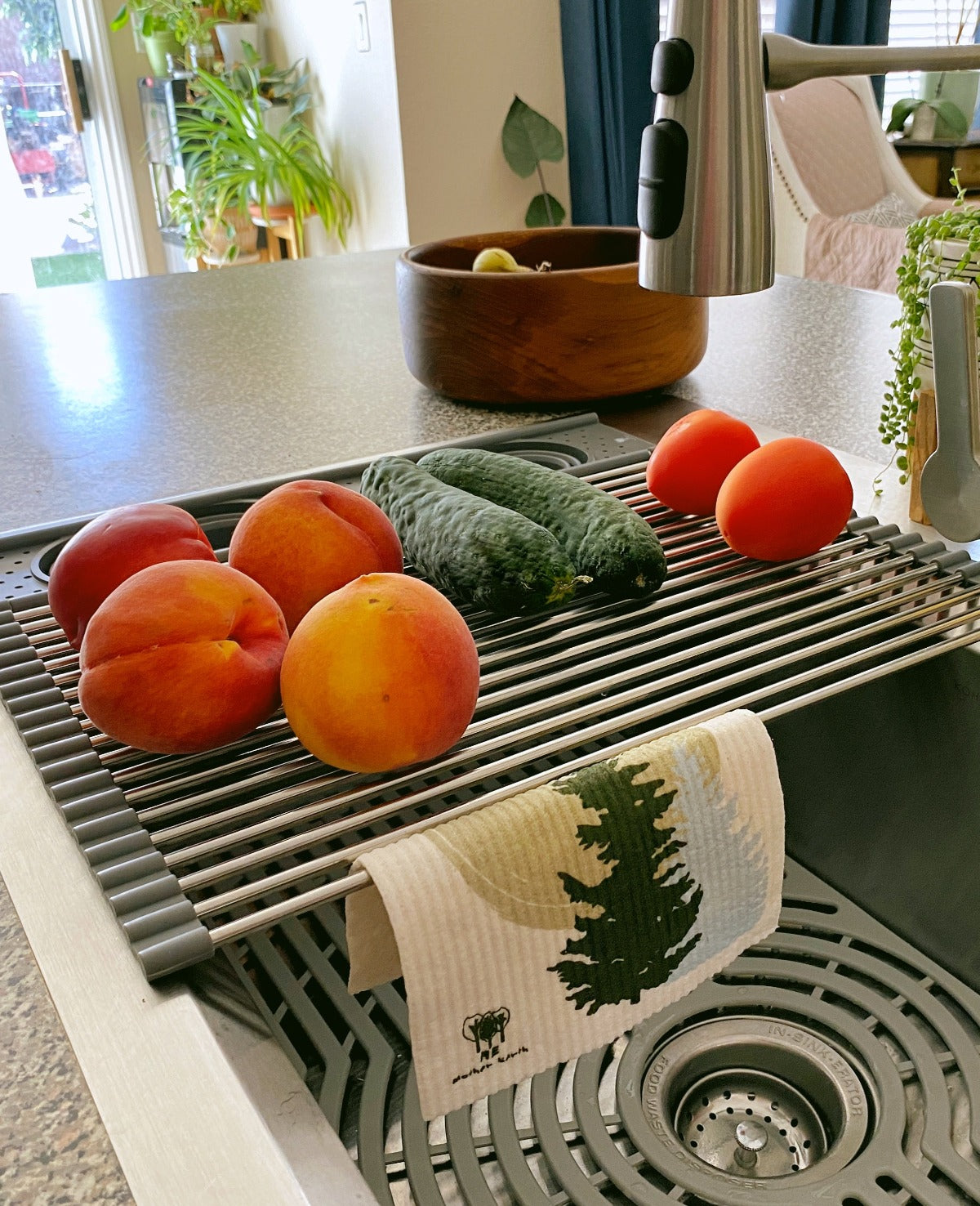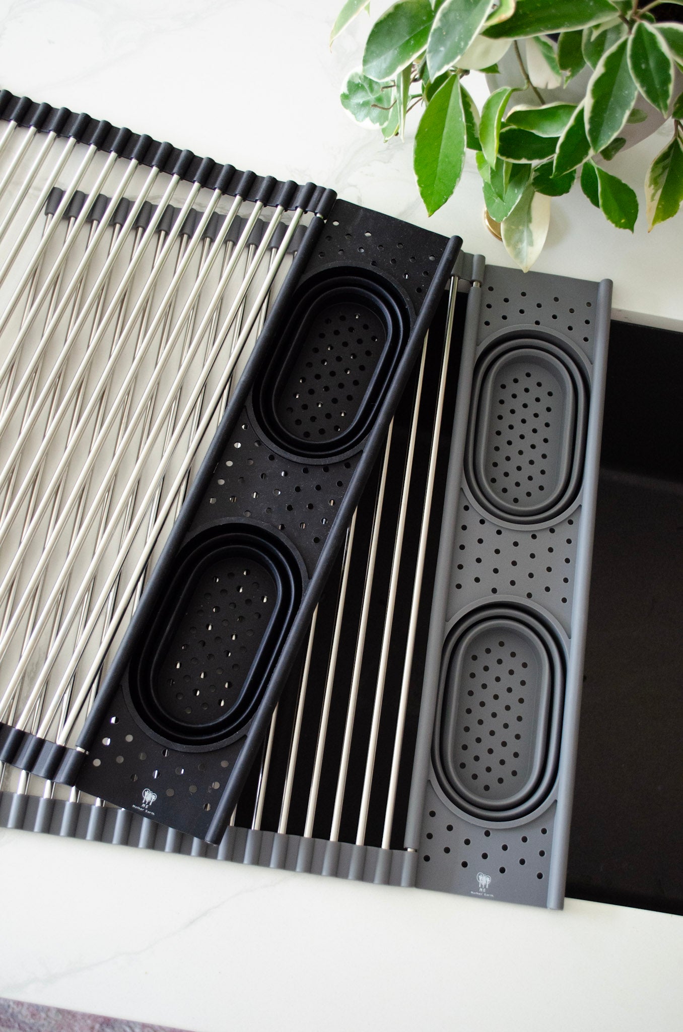 Multipurpose: Keep your kitchen counters free from clutter. Use as a colander to wash and dry produce or use with a cutting board to give yourself extra food prep space. Use for hand washing and drying cutlery, dishes, glassware, pots and pans, and more. It can be extended over countertops to be used as trivet for hot pans and pots or even as bakers rack for pies and fresh bread. You can even use to defrost food, allowing the water to drain right into the sink!